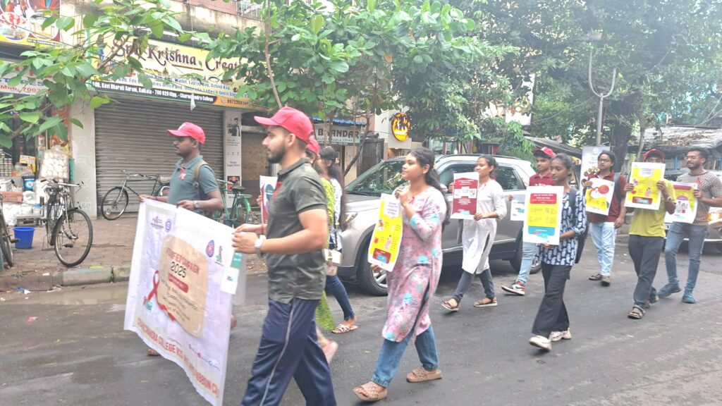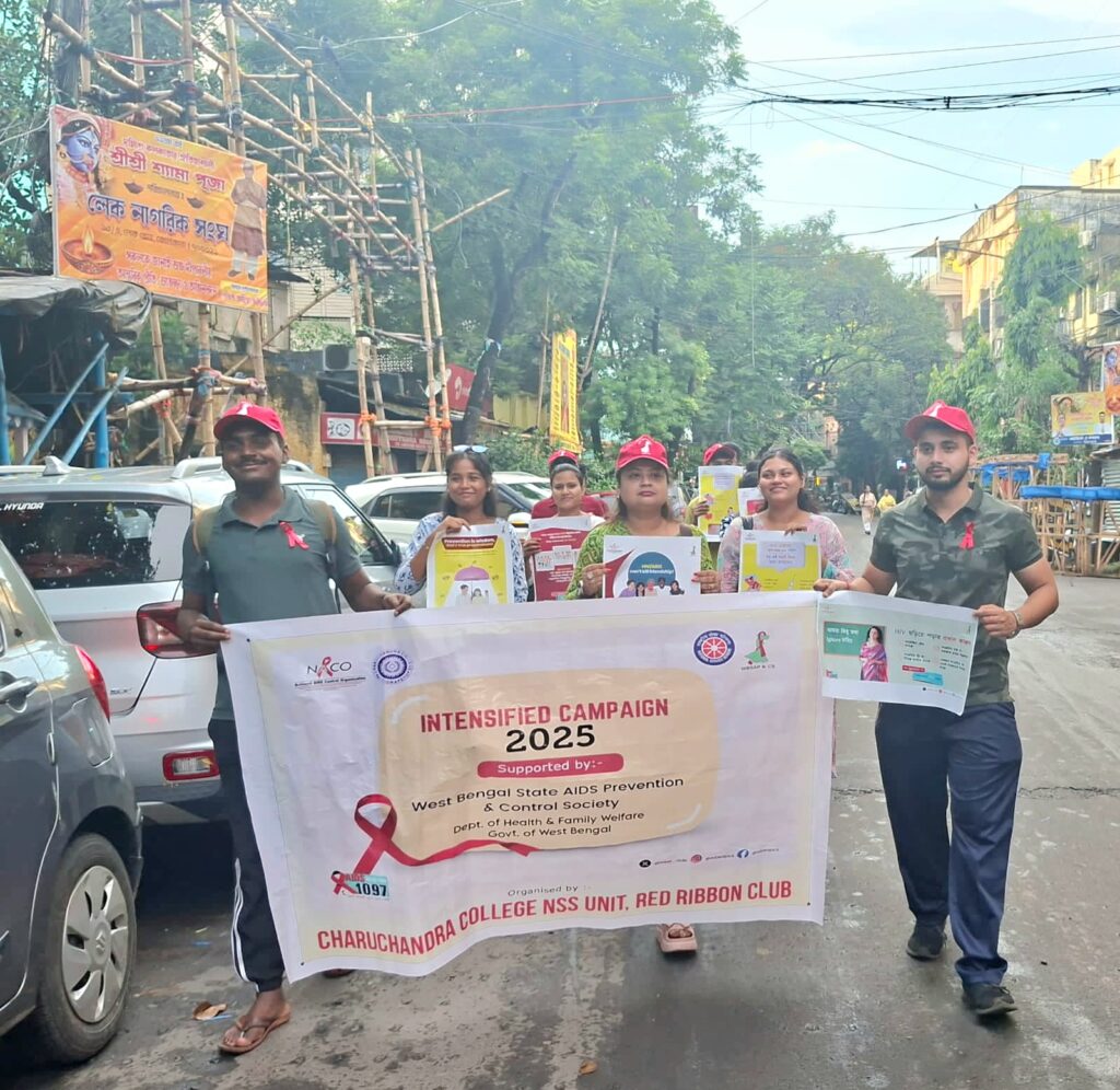 📝 নিজস্ব সংবাদদাতা, Todays Story:এইডস ও এইচআইভি মুক্ত বিশ্ব গড়তে চারুচন্দ্র কলেজ এনএসএস রেড রিবন ক্লাবের আয়োজনে আজ এইচআইভি ও এইডস সচেতনায় এক আয়োজন অনুষ্ঠিত হল লেক মলের সামনে। চারুচন্দ্র মার্কেট এলাকায় পদযাত্রা ও পথচারীদের মধ্যে সচেতনতা ছড়িয়ে দেওয়া হয় এদিন।উক্ত অনুষ্ঠানে সহযোগিতার হাত বাড়িয়ে দিয়েছিল WBSAP & CS ও NACO।সারাবছর চারুচন্দ্র কলেজ এনএসএস, রেড রিবন ক্লাবের ছাত্র ছাত্রীরা সচেতনতার বার্তা পৌঁছে দেন মানুষের কাছে। ফ্ল্যাশ মব, সাংস্কৃতিক অনুষ্ঠান, ওয়াল পটারিমহ, পদযাত্রার মাধ্যমে। এই প্রয়াসে ইতিমধ্যেই সমাজের বহু পরিচিত মুখকেও দেখা গিয়েছে মঞ্চ থেকে সাধারণ মানুষের জন্য এইডস /এইচআইভি সচেতনতা বার্তা পৌঁছে দিতে। আগামীদিনেও এইভাবেই সমাজ সচেতনতার অঙ্গীকার করা হয় উক্ত অনুষ্ঠানে থেকে।
