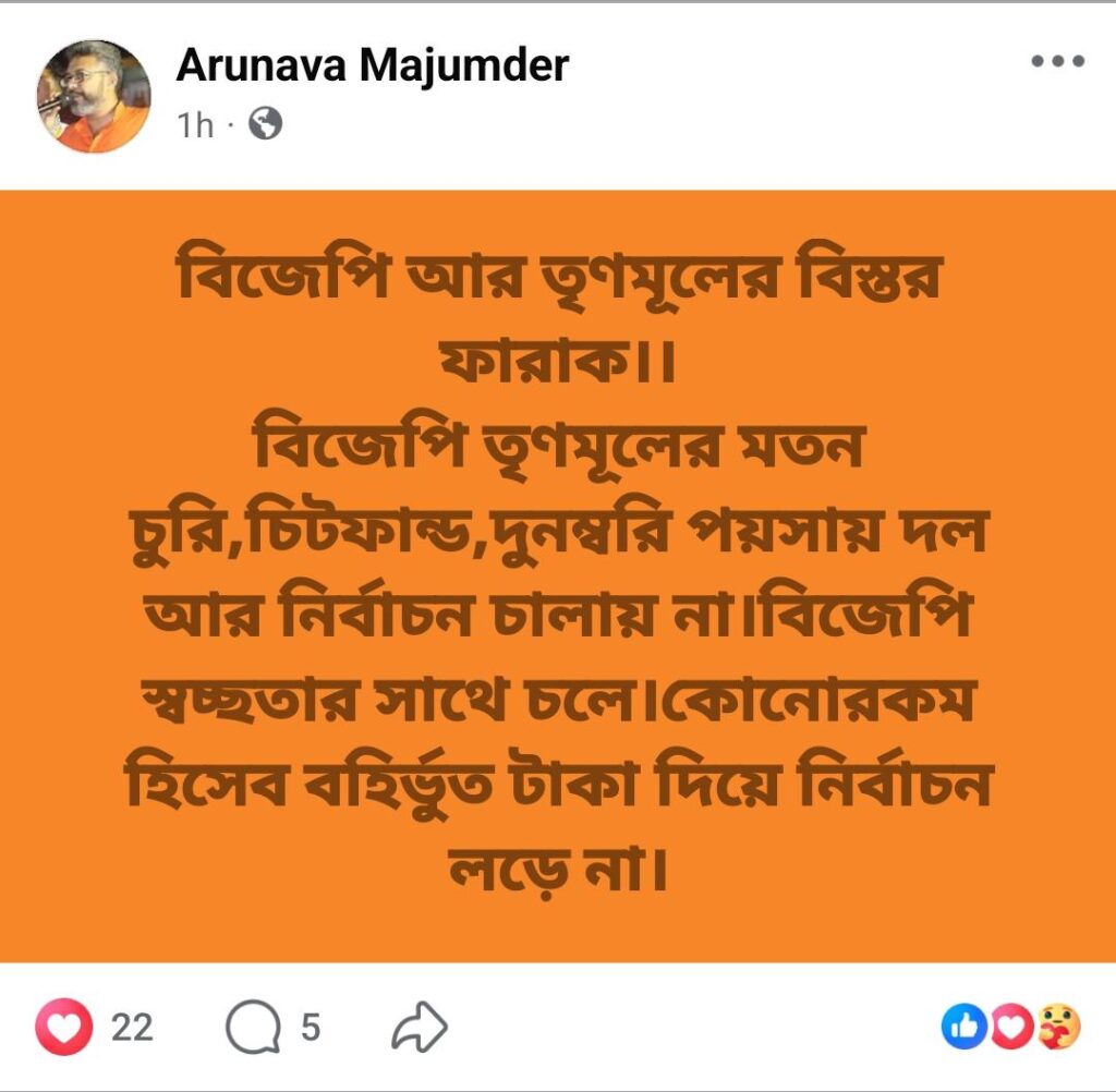 এই প্রসঙ্গে বিজেপি নেতা অরুণাভ মজুমদার জানান, “নির্বাচনের জন্য এই অর্থ সম্পূর্ণ বৈধ এবং হিসাবমাফিক। এর মধ্যে কোনও অনৈতিক বা বেআইনি বিষয় নেই।”
